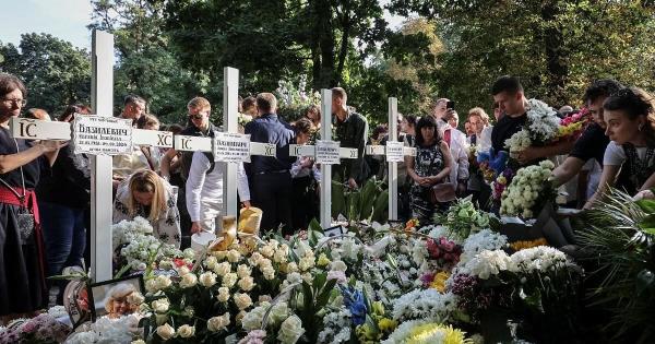 送葬者将棺木列队运到教堂时,唱诗班唱起了歌。人群中许多人拿着向日葵;一些人穿着传统的乌克兰衬衫。
