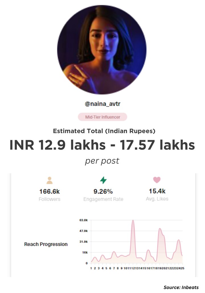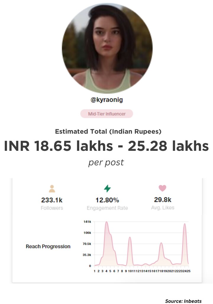 使用开源工具,我们估计凯拉的Instagram账号的每条帖子的参与率为12.80%,收入约为200万至250万卢比基于配置文件性能分析。估计数字还表明,人工智能产生的网红的收入与人类网红相当。