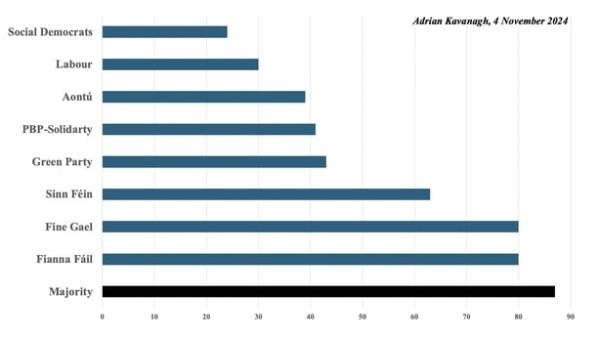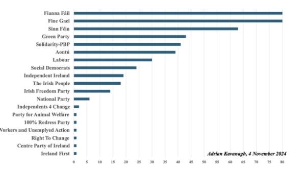 在爱尔兰历史上的大部分时间里,曾经主导爱尔兰政治体系的两个传统大党——共和党Fáil和统一党——现在的候选人数量往往比20世纪初要少。这反映了过去二十年来爱尔兰政治中日益严重的政治分裂。这绝不是确定的,但在这一点上,如果所有人/大多数人都成功,任何政党都不太可能提名足够的候选人来组建一党政府,这将是该州历史上第一次发生这种情况。