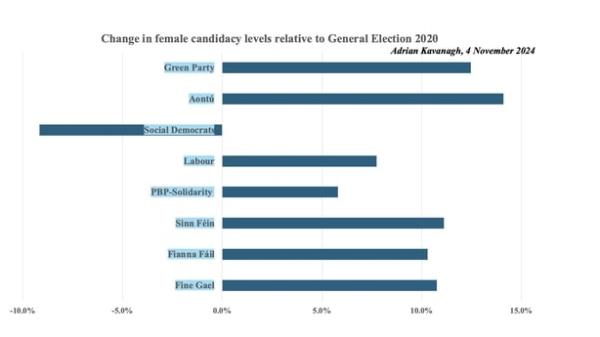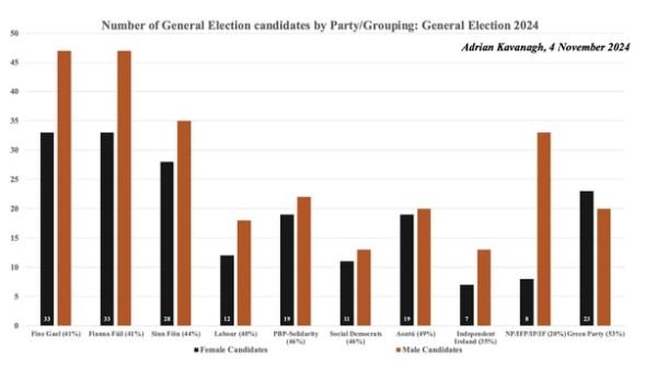 共和党Fáil和统一党这一次总体上都成功地实现了性别配额目标,尽管这一目标从30%增加到40%,因为选区层面的选择已经取得了进展。FF和FG的最终女性候选人比例可能略高于40%的水平,而其他政党的女性候选人比例,如绿党和Aontú(如上所述),以及人民先于利益团结和社会民主党,将会更高。