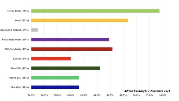 目前,绿党的女性候选人比男性候选人多,而Aontú的男女候选人数量非常接近。大多数(如果不是全部的话)较大的政党似乎都在顺利地实现40%的性别配额目标。