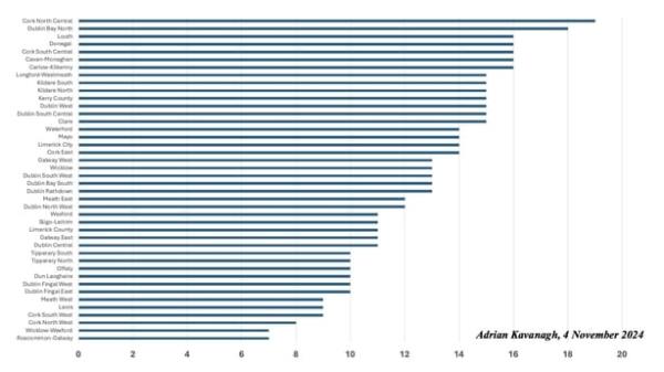 正如附图所示,各选区在竞逐这些职位的候选人数目方面,亦会有显著的差异。当然,考虑到我们尚未有这些选区的最终、确定的候选人名单。到目前为止,许多选区的选票似乎都很长,特别是科克中北部和都柏林湾北部,目前已经接近20名候选人。