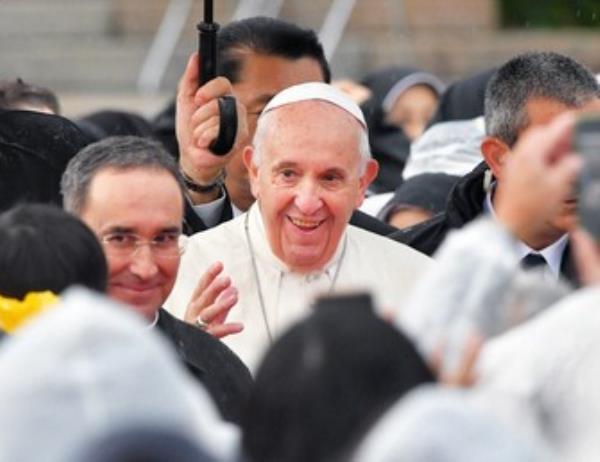 11月24日,教皇方济各在长崎访问期间向聚集的众多信徒微笑。(每日/美智子Morizono)